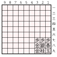 相振り飛車のときに用いられる、金を2枚横に並べた囲い。2枚金とも言います。囲いとしては弱点の多い形ですが、自分から先攻したい場合に有効です。