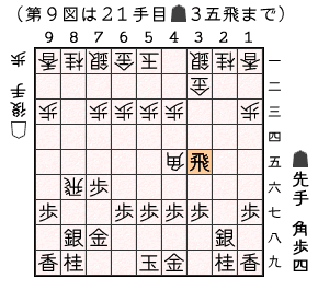 a・・・4五角戦法の第一歩(下に補足)。この手に変えて△3八歩は別ページ参照 b・・・▲3五飛の変化を第9図より