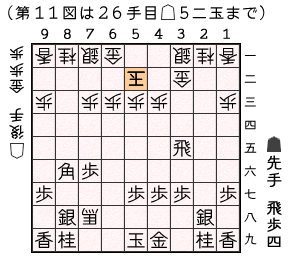 - 本手順、△7八馬には▲8六角の一手。以下△8八馬なら▲5三角成の攻め合いで先手優勢です。次に▲3ニ飛成の必殺手があるので、△4ニ金打と受けるのは仕方ないですが、▲6ニ歩(=参考図)が好手。この手は後の▲8五飛をより厳しくさせた手です。従って、▲8六角には一旦△5ニ玉と角成りを受けます。△5ニ玉のところ、△4ニ玉と受ける変化は第12図より。